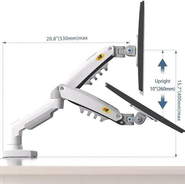 FULLY ADJUSTABLE RANGE: Your two screens will have 360deg rotation, tilt angle +85deg to -30deg, swivel +-90deg Upright up to 10"(260mm) and max extension is 20.8"(530mm). Both arms of the desk mount can be easily adjusted anyway you would like.