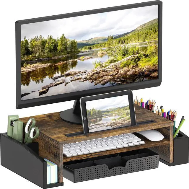 Simple Houseware Desk Monitor Stand Riser with Adjustable Organizer Tray, Rustic Brown
