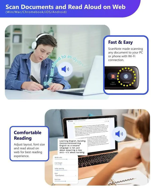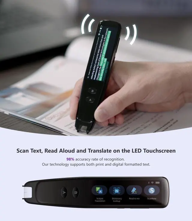 BUILT-IN DICTIONARY & THESAURUS: Scan words and terms to (1) define and provide example sentences for on-the-go learning, as well as (2) learn to pronounce them out loud. Perfect for individuals with dyslexia, learning difficulties, and sight impairment, as well as for language learners, students of all ages, working professionals, or those just looking to expand their vocabulary. ^^ SEND TEXT & RECORDINGS TO PC / LAPTOP - Easy Wi-Fi-enabled software integration with our online interface ScanNote. Scan and record to automatically send text and audio to classroom Chromebooks, PCs, laptops, or any device you open ScanNote on. ^^ SCAN, SAVE, REPLAY, AND REVISIT ON PC - Scan words and phrases once and repeatedly listen on your PC by connecting to ScanNote, an immersive reader, enhancing the learning and reading experience with layout change, font change, highlight, and dictionary. Best for dyslexia. ^^ MULTI-LANGUAGE SUPPORT- Our proprietary language recognition and context comprehension technology can recognize, define, and speak in 57 languages with a Wi-Fi connection. Our digital scanning pen is perfect as an on-the-go tool for travel, exams, schoolwork, and more.