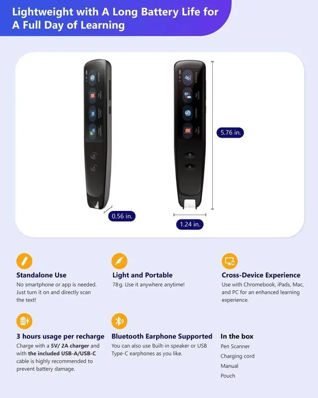 TEXT TO SPEECH - Scan words, phrases, or full sentences with our digital scanning pen to turn them into audio. Our proprietary AI-based text recognition and text-to-speech technology can read, understand, and speak 57 languages aloud to support reading comprehension and pronunciation without needing a tutor or mobile phone. ^^