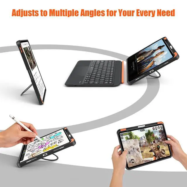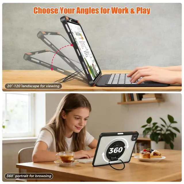 ^^ 360 Free-View Kickstand: The sturdy backplate incorporates a smooth, 360 rotating hinge. Effortlessly switch between landscape and portrait modes to find the perfect viewing angle for typing, drawing, watching videos, or video calls. Its your all-in-one stand for study, work, and entertainment.
