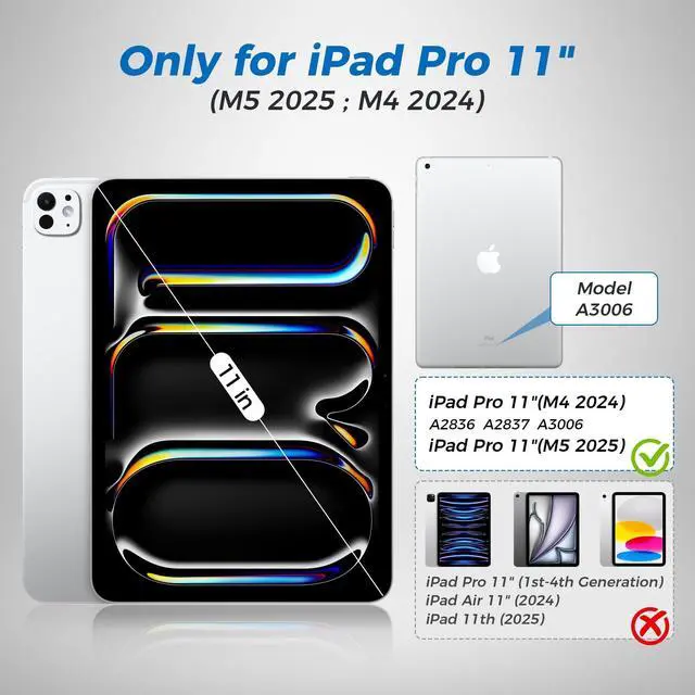 Compatibility: Specifically customized for iPad Pro 11 inch M4 2024 (A2836A2837A3006), and iPad Pro 11 inch M5 2025 (A3357, A3358). NOT compatible with other models. Please check your iPad model before purchasing.
