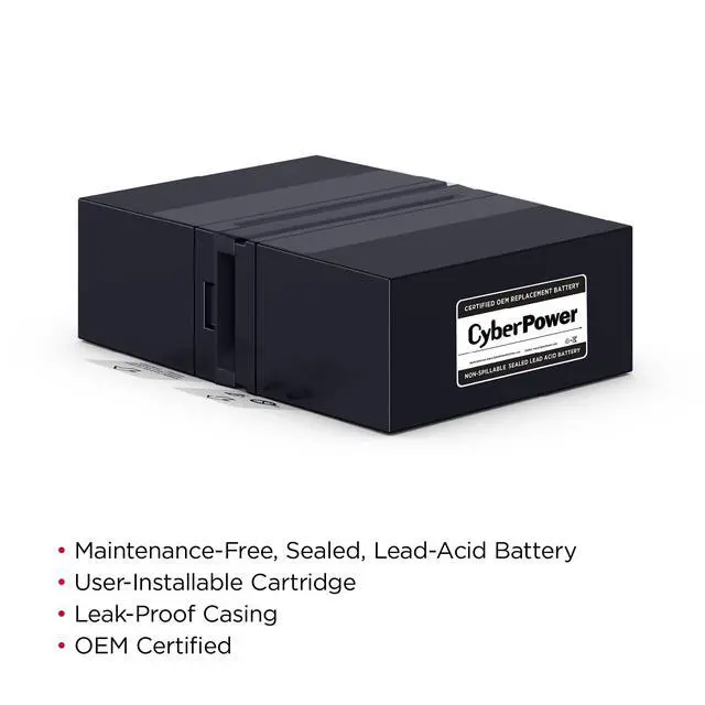 The RB1280X2B UPS Replacement Battery Cartridge restores life to CyberPower UPS systems that have weak or completely depleted internal batteries. The RB1280X2B contains two 12V/8AH batteries, certified to meet or exceed original manufacturer specifications. These leak-proof, sealed lead-acid batteries never require replacement fluid. The pre-assembled cartridge installs easily in your CyberPower UPS system and is shipped with reusable packaging which can be used for delivering expired batteries to a suitable recycling center. RB1280X2B comes with instructions, recycling information, and an eighteen-month warranty. Compatible with the