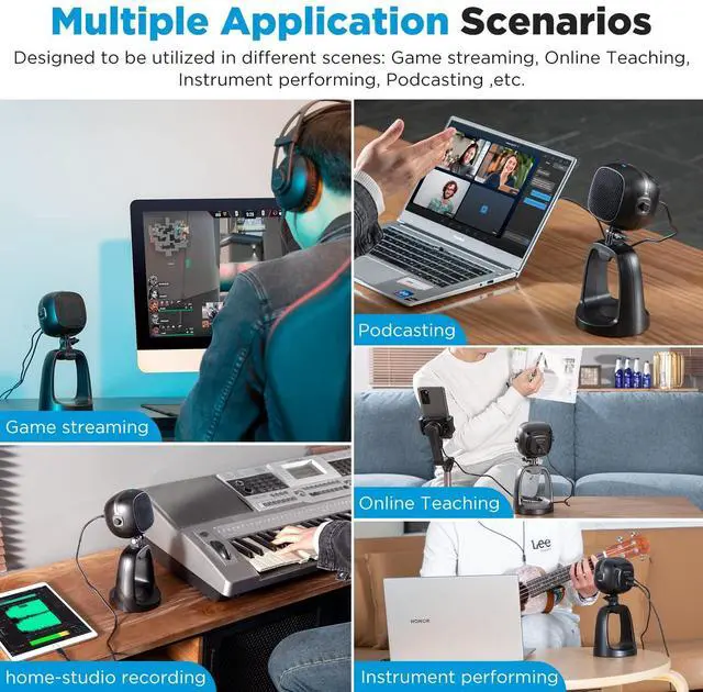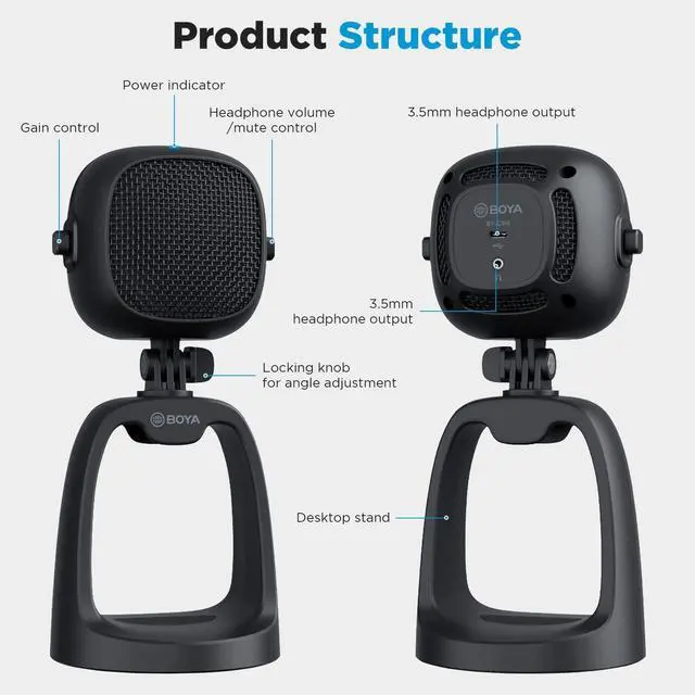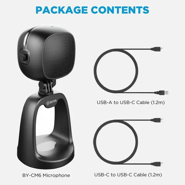 The BY-CM6 is a USB desktop microphone for most Android phones and Windows/Mac computers. The BY-CM6 features a cardioid pickup pattern that focuses on capturing the sound in front of the microphone and effectively reducing background noise. It can be used in a variety of settings, such as home studio recording, podcasting, vocal performances, and more. The BY-CM6 has gain control, headphone volume control and mute function. The 3.5 mm headphone jack on the back of the unit allows for real-time monitoring. The product is equipped with a removable desktop stand, so users can freely adjust the microphone angle according to their own use scenarios.