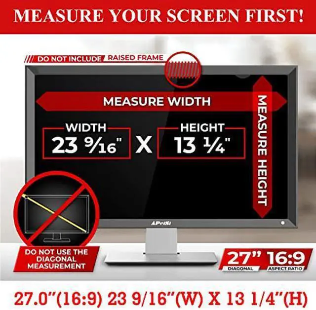 PRIVACY FILTER DIMENSIONS: WIDTH: 23 9/16" (598 mm), HEIGHT: 13 1/4" (337 mm) - No matter where you're working, don't put your information at risk! Protect your privacy with a APeiSi privacy filter for monitor at work and at home. With touchscreen compatibility for every size, you can safeguard any computer including HP, Dell, and more. Please verify your computer screen's width and height measurements before ordering as it's not recommended to only measure your screen's diagonal size.