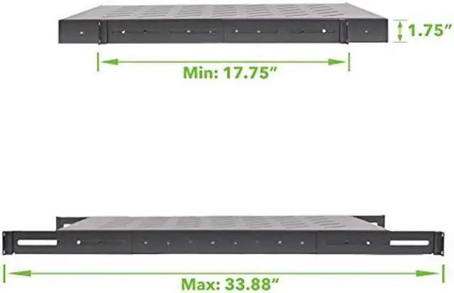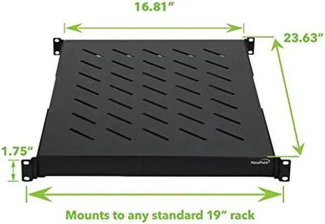 This line of NavePoint shelves is designed with flexibility in mind. The depth can be adjusted from 18 to 34 inches. It has slotted venting to reduce the possibility of overheating. Made of high quality cold rolled steel with a powder coated finish that protects them from rust and corrosion. Assembly required.