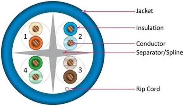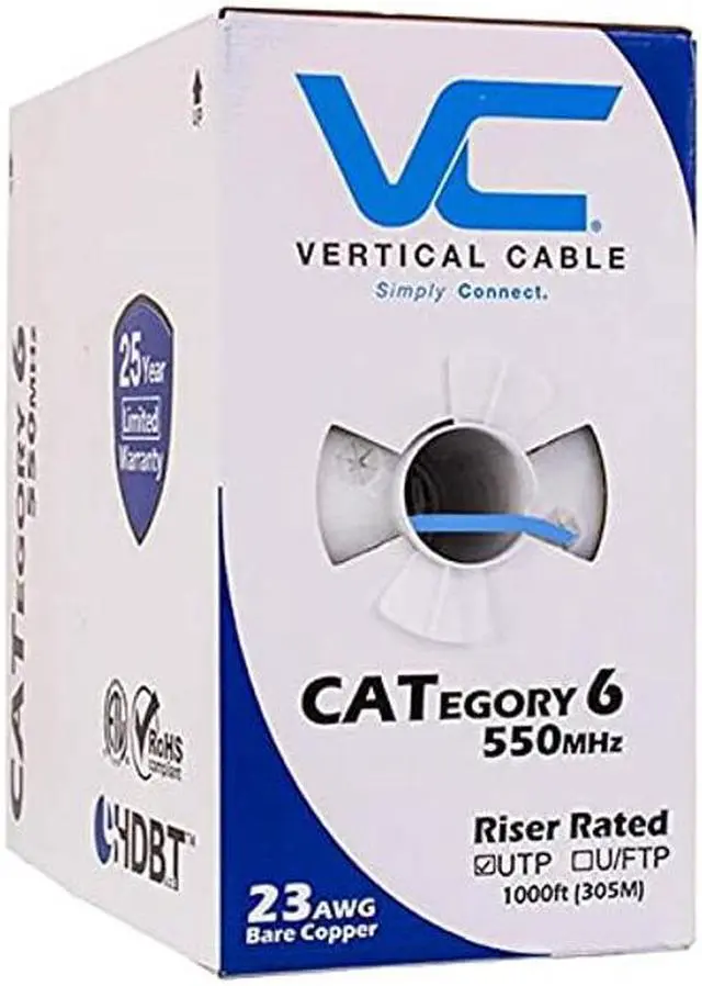 The insulation material is PE and the jacket is made of PVC. This cat6 bulk cable is supplied in 1000 ft pull box and sequential length markings are printed on the jacket. Brand for this product is Vertical Cable.