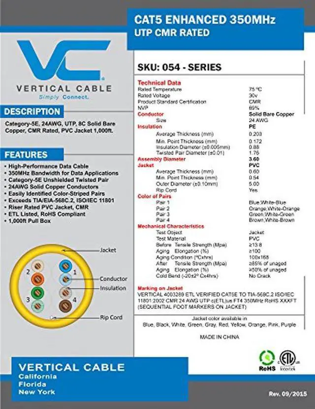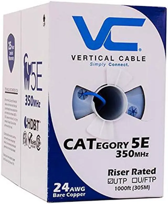 This Cat 5e unshielded twisted pair ( utp ) cable is a high performance data communication cable suitable for 350mhz high speed applications. It has excellent attenuation and crosstalk characteristics and exceeds TIA/EIA-568-C. 2 specification. This ethernet cable is designed for indoor and riser network installations and is approved by ETL to be type CMR. The wires are 24 awg in size and are made of solid bare copper conductors. All 4 pairs are easily identified by color stripes. The insulation material is PE and the jacket is made of PVC. This cable is supplied in 1000 ft pull box and sequential length markings are printed on the jacket.