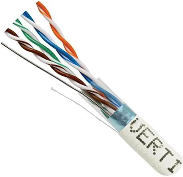 This Cat5e shielded twisted pair F/UTP cable is a high performance data communication cable suitable for 350mhz high speed applications. It has excellent attenuation and crosstalk characteristics and exceeds TIA/EIA-568-C. 2 specification. This ethernet cable is designed for indoor and riser network installations and is approved by ETL to be type CMR. The wires are 24 awg in size and are made of solid bare copper conductors. All 4 pairs are easily identified by color stripes. The insulation material is PE and the jacket is made of PVC and the cable is equipped with AL foil as a shield with Drain wire.