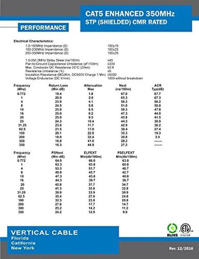 This Cat5e shielded twisted pair F/UTP cable is a high performance data communication cable suitable for 350mhz high speed applications. It has excellent attenuation and crosstalk characteristics and exceeds TIA/EIA-568-C. 2 specification. This ethernet cable is designed for indoor and riser network installations and is approved by ETL to be type CMR. The wires are 24 awg in size and are made of solid bare copper conductors. All 4 pairs are easily identified by color stripes. The insulation material is PE and the jacket is made of PVC and the cable is equipped with AL foil as a shield with Drain wire.