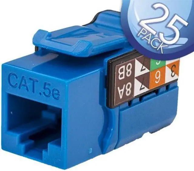 Vertical Cable Cat5E 90 Degree Keystone Jack 25 Pack The Cat5e Jack is the most widely used keystone jack in today's market for networking wall plate solutions or patch panels. Each Cat5e Jack provided by FireFold provides outstanding performance, exceeding the TIA/EIA 568-B industry standard. This makes these keystone jacks perfect for use in today's high-speed networks while remaining completely backward compatible with all previous standards. The Cat5e jack provided by us comes with a standard RJ45 plug on the outside. While on the inside, wiring slots are in place for a tool required termination.