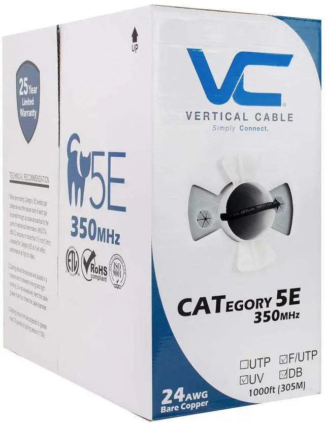 Vertical Cable CAT5E, Shielded Dual Jacket, Direct Burial, 1000ft, Black, Bulk Ethernet Cable