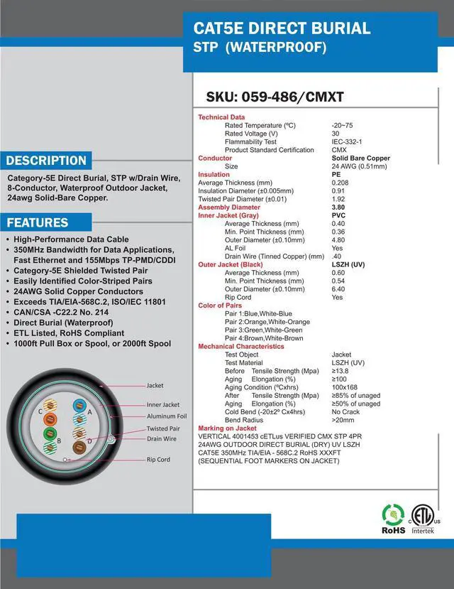 • Cat 5e CMXT 350 Mhz F/UTP Direct Burial 1000 feet Outdoor cable