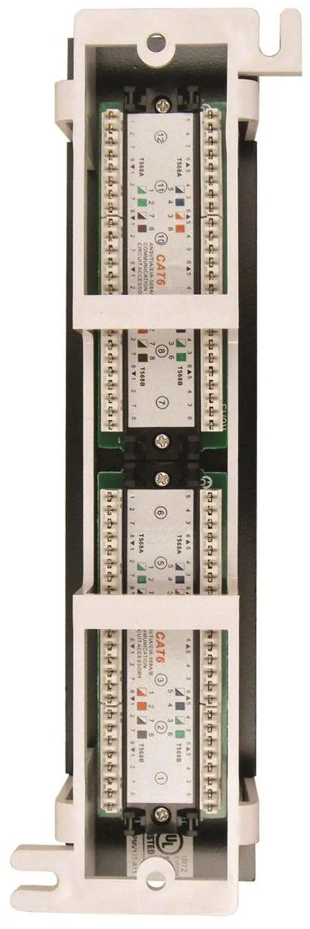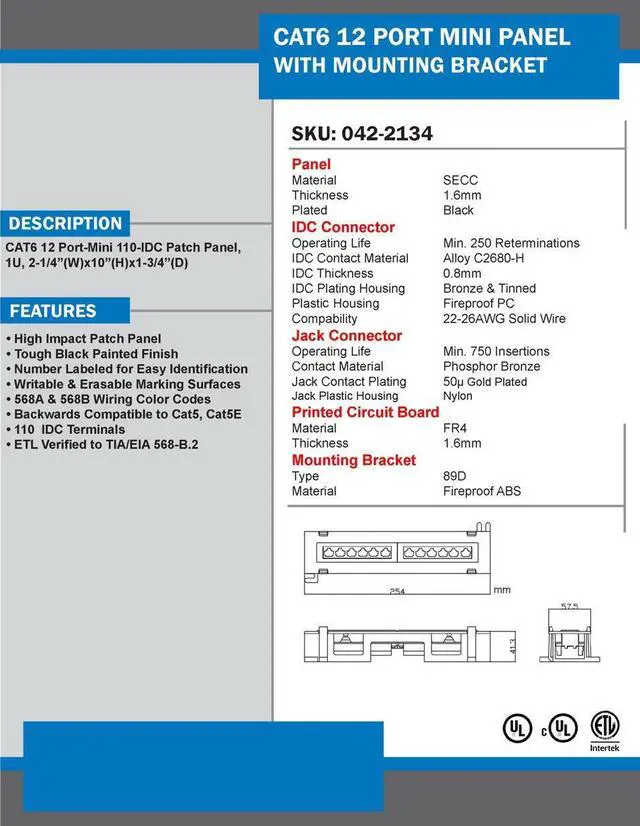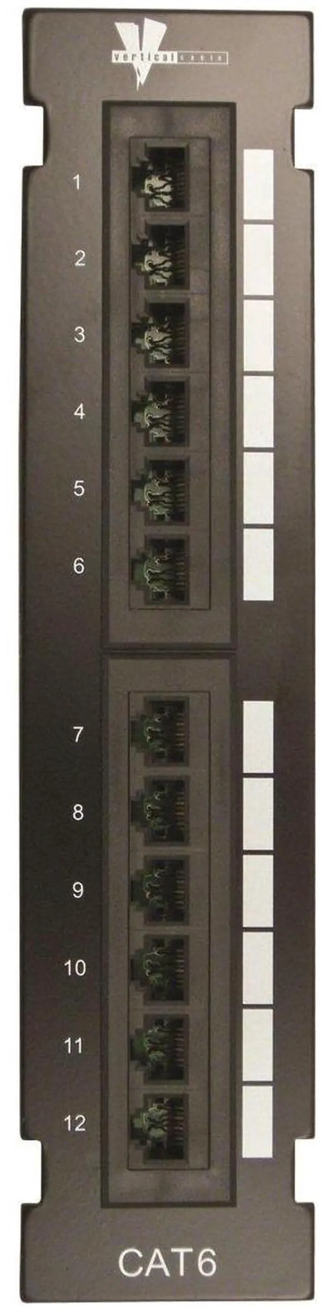 This product is a 12 port vertical cat6 mini patch panel. At the front it is number labeled for easy identification and has writable and erasable marking surfaces. Jack connectors are gold plated to 50 micron thickness and the minimum operating life of jack connectors is 750 insertions. The minimum operating life of the 110 IDC connectors is 250 terminations and they are compatible with 22 to 26 awg solid wires. A mounting bracket is included in the package. Brand for this product is Vertical Cable.