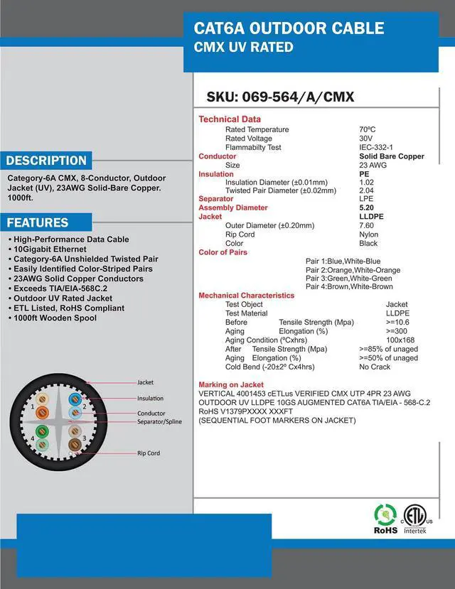 Vertical Cable CAT6A UV Rated Outdoor Bulk Cable 1, 000ft. - Black