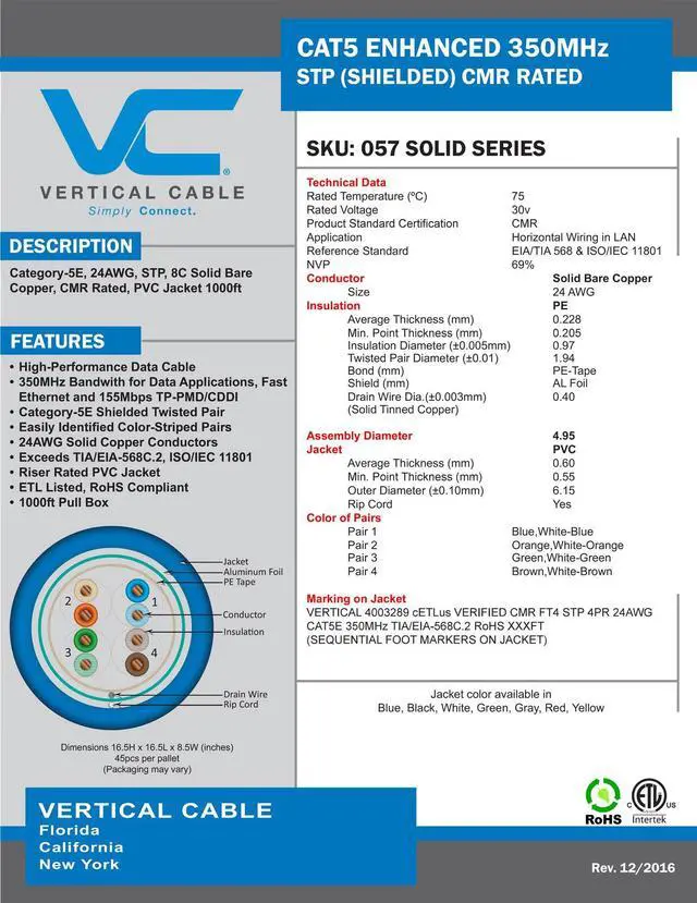 • Vertical Cable 057-469/S/BL Cat5e 350 mhz F/UTP 1000 feet