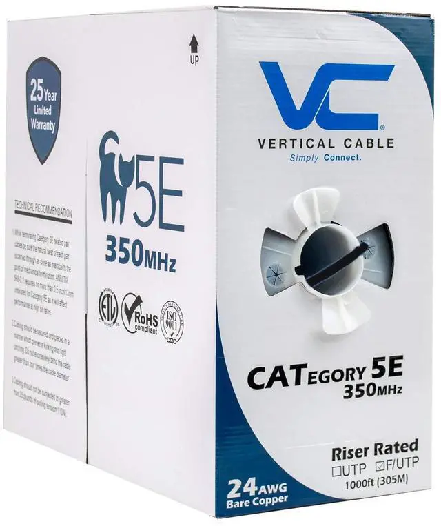 Vertical Cable Cat5e, 350 MHz, Shielded, 24AWG, Solid Bare Copper, 1000ft, Bulk Ethernet Cable, Black