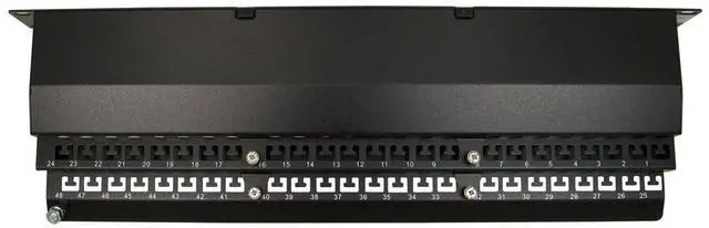 This product is a 48 port shielded 19" horizontal rackmount 1U cat6A Krone type patch panel. At the front it is number labeled for easy identification. Jack connectors are gold plated to 50 micron thickness and the minimum operating life of jack connectors is 750 insertions. The minimum operating life of the Krone type IDC connectors is 250 terminations and they are compatible with 22 to 26 awg solid wires. Brand for this product is Vertical Cable.