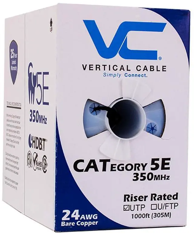 Vertical Cable Cat5e, 350 MHz, UTP, 24AWG, 8C Solid Bare Copper, 1000ft, Black, Bulk Ethernet Cable - 054 Series