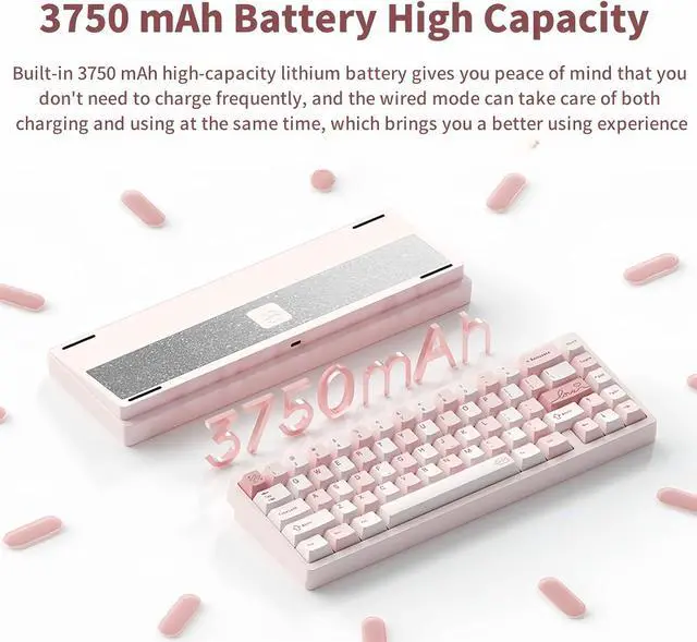 Tri-mode Connection: Work with Bluetooth 5.0, 2.4GHz,Type-C wired connection,This rechargeable keyboard is equipped with a 3750mAh large-capacity battery,which has long-lasting battery life
