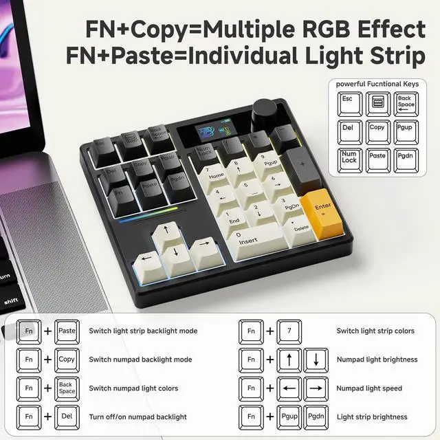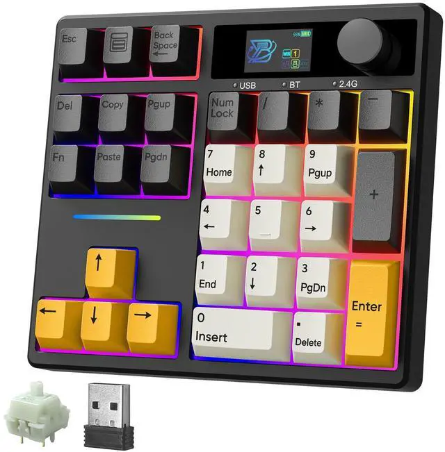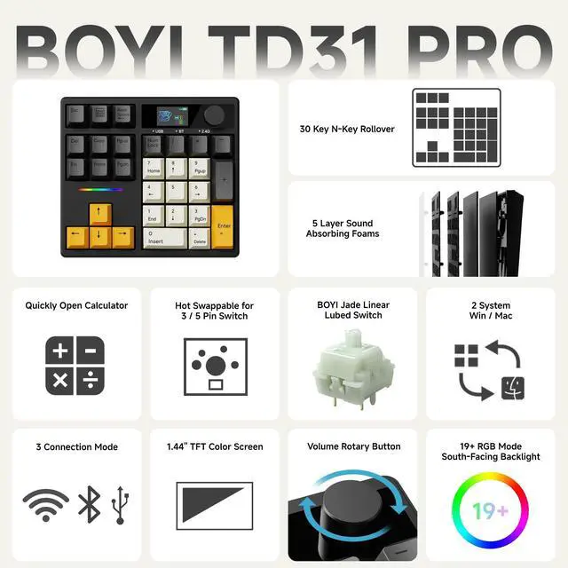Display Screen: Is there anything this TD31Pro mechanical number pad can display? Custom DIY gif image, numlock, connection mode, WIN/MAC system, battery status, RGB Mode, etc. Enjoy the fun of Custom your own unique keypad ^^ Mode Switching&Enhanced