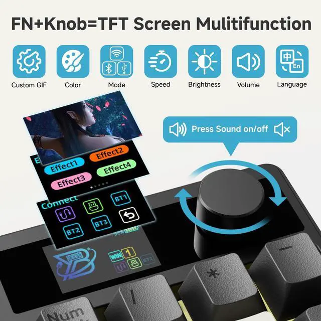 Metal Knob: Default Volume Mode's Knob Can One Click to Mute! Press the FN+knob to quickly switch volume/screen modes. The knob of the screen mode Can easy control the Screen display content but not Support one Click to Mute ^^ Hot-Swappable