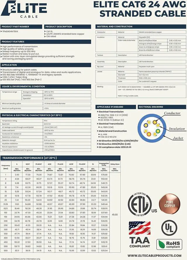 Cat6 Stranded 24AWG (CM) 1000 Feet, 24AWG UTP, 350MHz, Stranded, Our Cat6 stranded 24awg bulk cable has been used and trusted by many installers, organizations in both the private and public sector, the US Government and Fortune 500 Companies.