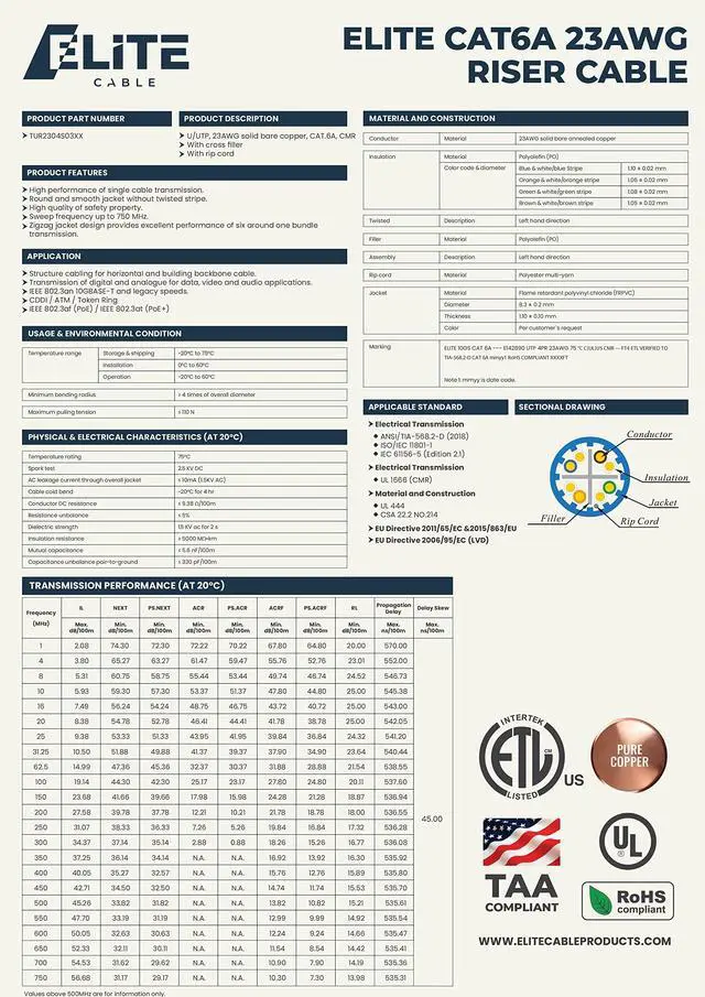 Cat6A shielded Riser cable supports 10Gb ( 10 Gigabit) Ethernet and 650MHz up to 328 Feet. Power devices such as: POE (Power Over Ethernet), computers, routers, IP Cameras