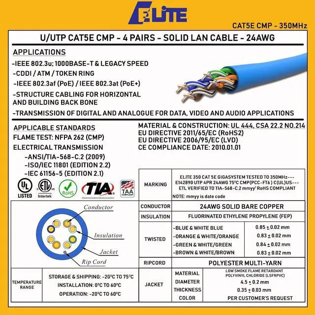 We have been in business for over 20 years and still running! We have a well versed team to assist on providing information and offer a variety of high quality products within our company. We strive to provide top notch education with top notch products and let our items speak for themselves. Elite Cable Cat5e plenum (CMP) rated cable is perfect for in the wall of your home or business, air ducts and drop ceiling installations. Our Cat5e is a staple in the industry as reliability and value come packed into this box. This cable is able to perform up to 1 gigabit speeds and has been tested up to 350 MHz.