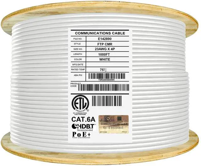 Power devices such as: POE (Power Over Ethernet), computers, routers, IP Cameras, switches, keystone jacks, RJ45's, modems, Xbox, PlayStation, Apple TV, ethernet adapters, Fax Machines, Smart TV's, Mesh networks, access points, cctv and much more! ^^ Packaged smoothly on a wooden reel this Cat6A shielded riser cable is easily deployed during installation. Every 2 feet of this cable is marked with length so you can keep track of how much you have used. ^^ Get the most certified Cat6A shielded Riser cable on with our UL Listed, LP Certification, ETL Verified, RoHS Compliant, TAA Compliant and 3rd Party Tested. All cable reels include UL Certified stickers. All cables have specification, Length and UL printing on jacket. Enjoy cable that prioritizes safety and performance. Able to pass building inspections and building code this cable combines fast speeds, durability and certification that your network will love.