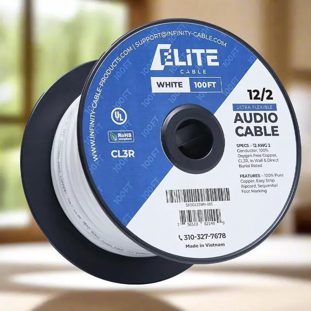 Elite 12/2 Speaker Wire 100ft, UL Listed, CMR/CL3R, (Riser/in-Wall & Outdoor/In-Ground (Direct Burial)- 100% Oxygen Free Pure Bare Copper (OFC), 12AWG/2-Conductor, 100ft Bulk Cable (65 Strands) White