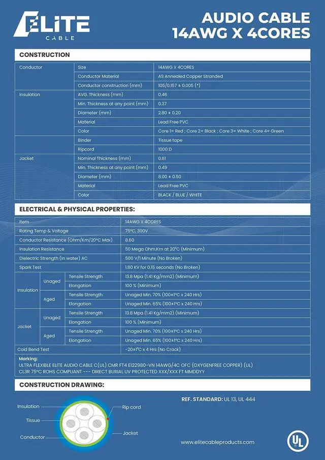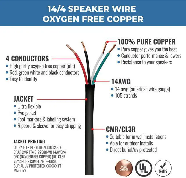 ^^ FEATURES: Our speaker cable comes in a variety of sizes (AWG) and conductor counts but all of them are made with Oxygen Free 100% Pure Bare Copper (OFC). All the cables are PVC Jacketed, with UV protection with ripcord for easy stripping. Each conductor is easy to identify and strand counts vary per size of wire. All are UL listed and RoHS compliant with a CMR/CL3R rated.