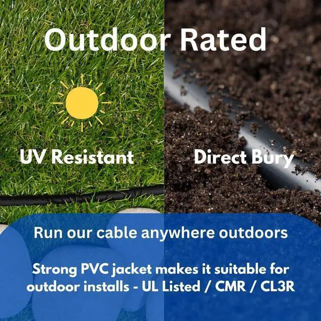 ^^ CMR/CL3R: Indoor/Outdoor Rated - Be sure to use the best quality and highly rated cables when apply them to your home or office. This is important when thinking of safety and the security of your family. Our CMR/CL3R rated cables are perfect for in-wall installs within the home or even be used with direct burial (UV protected) for those outdoor home entertainment systems. The PVC jacket provides great protection and our cable is ultra-flexible.