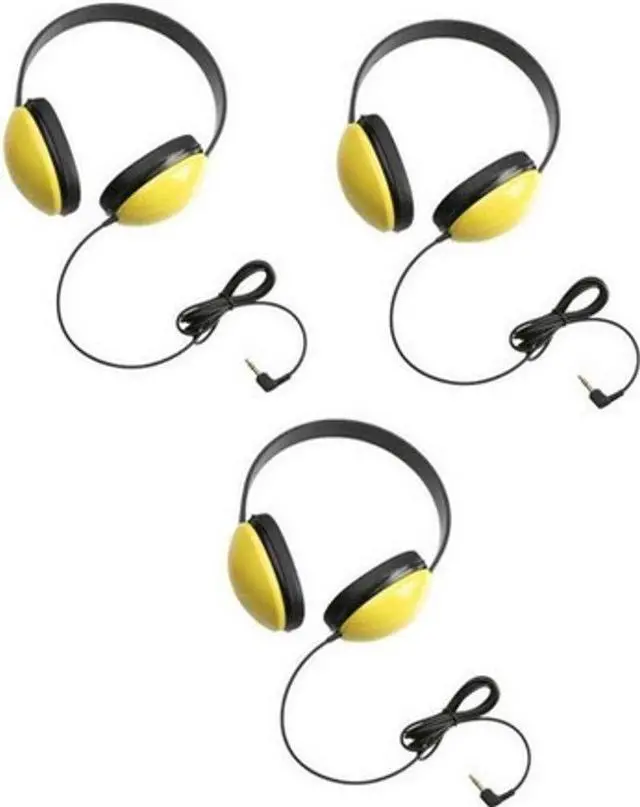 Califone 2800-YL Listening First Stereo Headphones (3-Pack), Yellow, Adjustable headband comfortable for extended wear, Specifically sized for young studentsThis Listening First stereo headphone is specifically built for young students with safety as its first concern. Rugged ABS plastic earcups withstand daily use with slotted earcup baffles to prevent accidental damage from prying fingers or foreign objects. The volume control is set from the audio source (not on the headphone or cord) for student safety. It is ideal for classroom story-time, library, and computer uses. Key FeaturesPermanently attached cord with reinforced strain connection Right angle plug resists accidental pull out 5.5 straight cord with 3.5 mm plug set at right angle reduces accidental pull-out Ambient noise-reducing earcup lowers outside noise so volume does not need to be as high, as recommended by audiologists for hearing safety Rugged ABS plastic earcups resist breakage in high-use situations