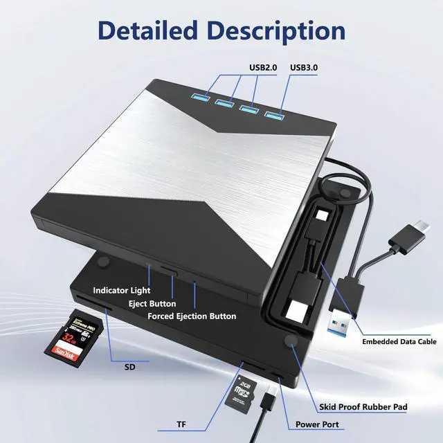 7 IN 1 Blu Ray Drive: Our blu ray drive external can not only burn and read CD/DVD/BD but also can be used as an external laptop USB hub, including 1 USB 3.0 port, 3 USB 2.0 ports, 1 TF slot, 1 SD card slot, compatible with USB hard drive, limited/wireless mouse & keyboard, computer cooler and other USB computer accessories, The card slot for transferring photo and video files from your camera from cards to computer.