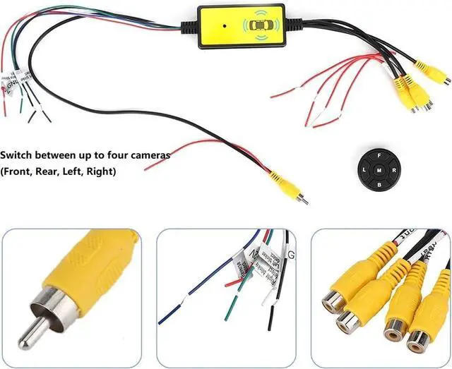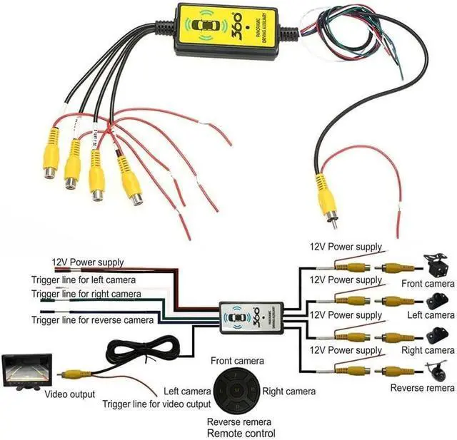 Four video inputs: Left view, Right view, Front view and Reverse view. There is + 12V power supply for each video input.