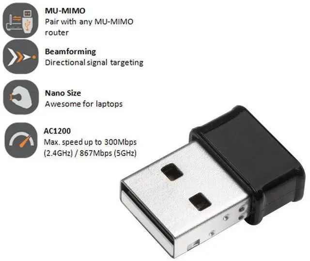 World's smallest AC1200 USB wireless adapter with MU-MIMO is here. Save space and your host device's battery life with smart features on the EDIMAX EW-7822ULC nano dual band AC1200 MU-MIMO USB adapter. This tiny dongle supports dual-band for speeds up to 867Mbps (5GHz) and up to 300Mbps ( 2.4GH z) with its 802.11 ac support. It is also backward compatible with 802.11 a/b/g/n standards. With MU-MIMO compatibility, it makes sure the supported router/AP can serve up fast and consistent speeds even when there are multiple devices on the wireless network. Its smart and efficient beamforming technology also directs its signals to drastically improve range, throughput, and coverage, as well as saves the battery life of your laptop in the meanwhile.