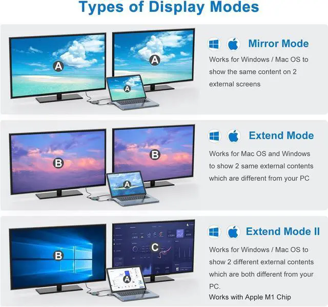 EXTEND MODE & MIRROR MODE: Extend mode allows you to view multiple tasks at the same time; Mirror mode can display the laptop on a large screen for visual enjoyment. Works for Windows and Mac OS to show 2 different or same external contents from your PC. HDMI ports can work simultaneously, small yet mighty.