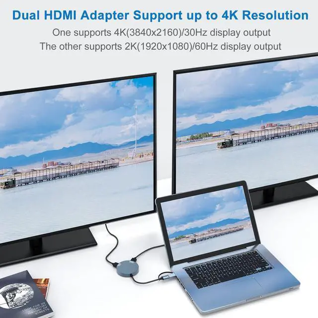 USB C AND USB 3.0 ADAPTER: Turn a single USB-C/USB 3.0 port into 2 HDMI(1*HDMI 4K@30Hz and 1*1080P@60Hz) ports. Add 2 monitors using our Dual HDMI adapters. Easily adapt USB 3.0 systems with included USB C to USB 3.0 adapter, fu
