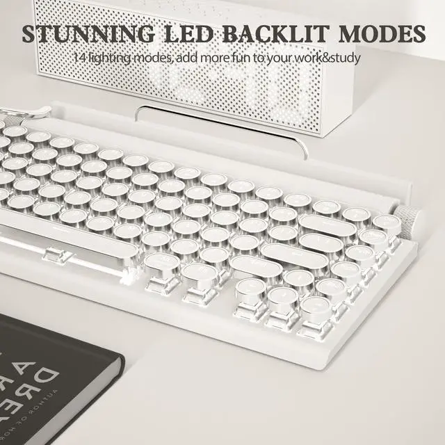 14 Modes Backlighting Switching: The round keycap design with punk style adds personality to your desk and enhances the look of this wireless mechanical keyboard. The white backlighting is easily adjustable using the stainless-steel lever. The left and right knobs control the brightness and volume respectively, and there are 14 backlight modes to choose from, allowing you to customize the keyboard to your individual preference