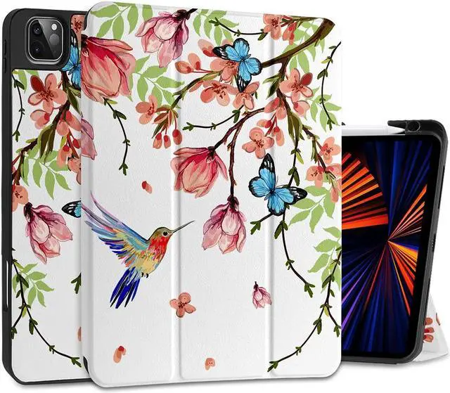 MEEgoodo for iPad Pro M2 12.9 Case 6th/5th/4th/3rd Generation 2022 2021 2020 2018 with Pencil Holder, Tablet Cover with Soft TPU Back Shell, Birds & Flowers