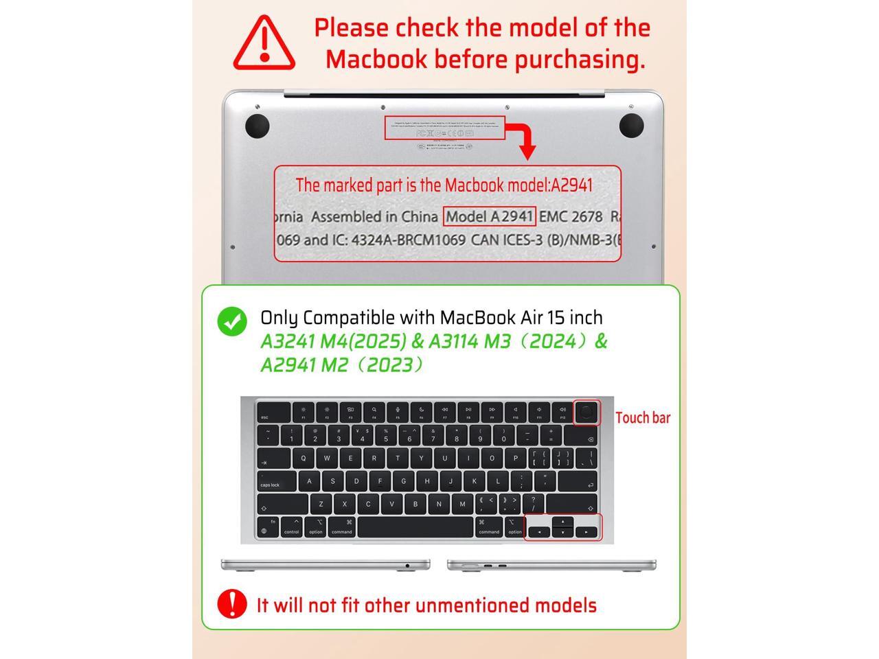 - COMPATIBILITY:The case was ONLY designed for MacBook Air 15 inch (model:A3241 A2941 A3114) M2 M3 M4 Chip with Liquid Retina Display & Touch ID 2023 2024 2025 Release.Please check the model number (AXXXX) at the bottom of your to determine the compatibility and refer to the attached picture to see if the model number is compatible with your Macbook.This case is NOT compatible with any other models