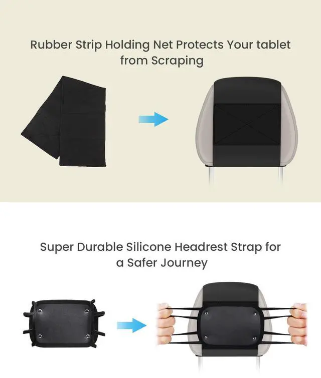 [(Simple & Safe)] Easy installation without any tools. Extensible strap fits most car headrests and holding net hold your tablet tightly, NO Scratches and Falling Anymore
