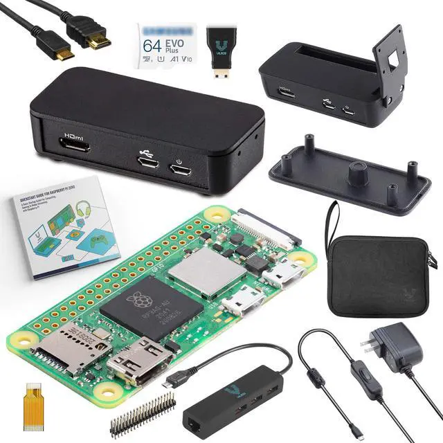 Includes: Raspberry Pi Zero w 2 Board, Case, Power Supply, 64GB Preloaded Micro SD card, Micro USB to 3 Port USB and Ethernet hub, HDMI to MINI HDMI Cable & Adapter so that you can connect to a monitor or use your existing cable to attach to a monitor, 40 Pin Header, Camera Module Adapter Cable, Storage Bag ^^ All Parts covered for 1 year under the Vilros Quality Guarantee