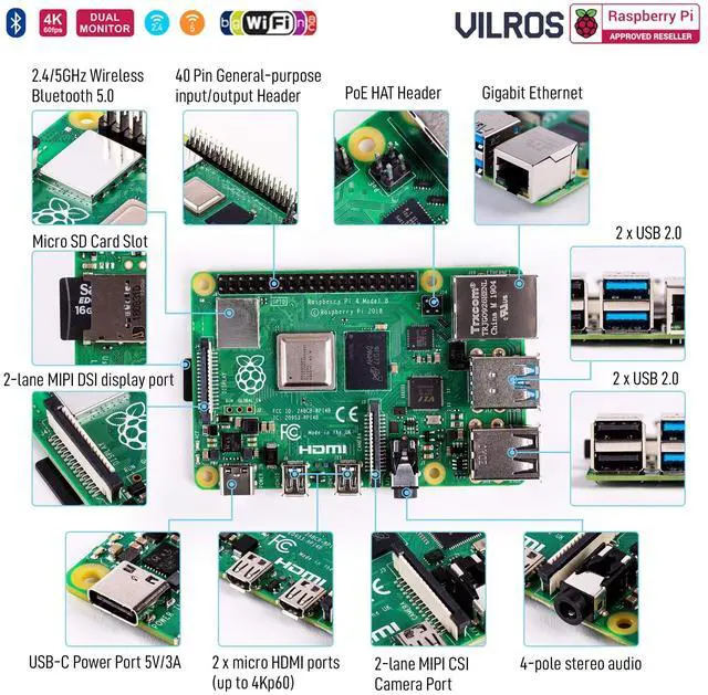 Complete Starter Kit for Pi 4 Includes Raspberry Pi 4 Model B Board and all the accessories you need to get started. ^^ 9-PART KIT WILL HAVE YOU READY TO GET UP AND RUNNING: Kit Includes 1. Raspberry Pi 4 Model B Board 2. Case With Easy to connect Built-in fan 3. 64GB Micro SD card Preloaded with RP OS 4. Vilros Pi 4 Compatible Power Supply with Inline on/off switch (Color May Vary) 5. Micro HDMI to Standard HDMI cable (5ft) 6. Micro SD to USB adapter to reflash card if desired 7. Neoprene Storage Bag to store all parts when not in use 8. Set of 4 Heatsinks 9. Vilros QuickStart Guide instruction booklet for Pi 4 ^^