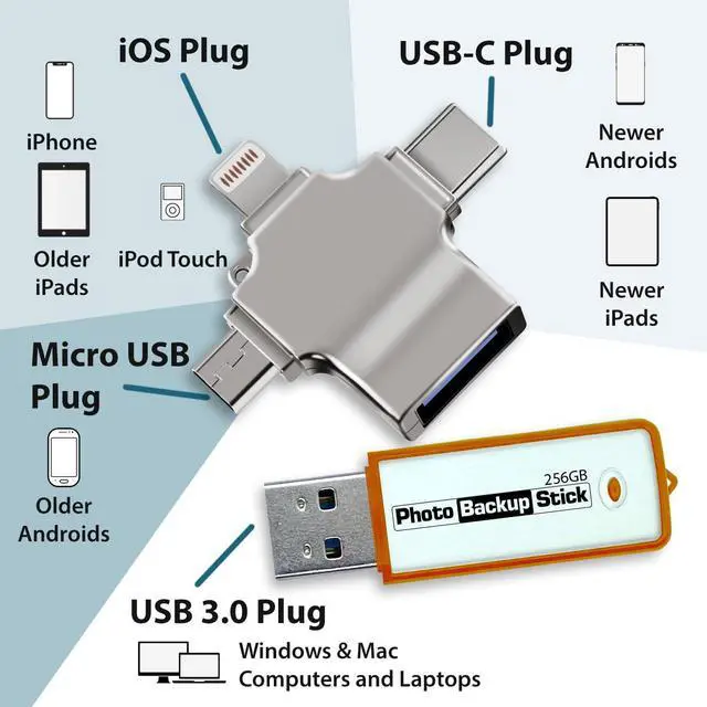 Photo Backup Stick Universal is an all-in-one picture and video backup and storage tool. It contains special software to back up from almost any computer, phone, and tablet. You dont need to buy a different backup drive for computers and phones. The Photo Backup Stick backs them all up with one tool. Keep your pictures safe without the need for expensive and complicated cloud services.