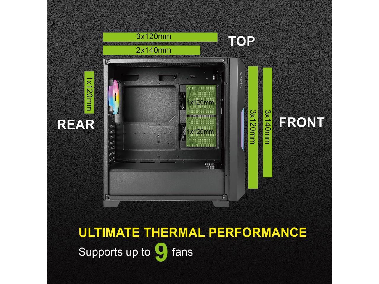 - Multifaceted Airflow Support: 3x120mm or 3x140mm fan ports in the front 3x120mm or 2x140mm fan ports on the top 2x120mm fan ports on the mb side 1x120mm fan port in the rear (1x120mm LFO-2512D ARGB Fan included) total fan support up to 9 x 120 mm fans