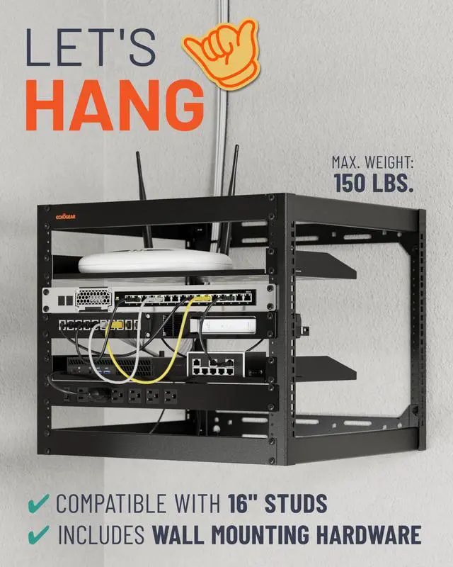 Let's hang! Rack can hold up to 150 lbs of your gear securely to the wall. Includes all wall mount rack hardware in the box so you can skip the Home Depot run!