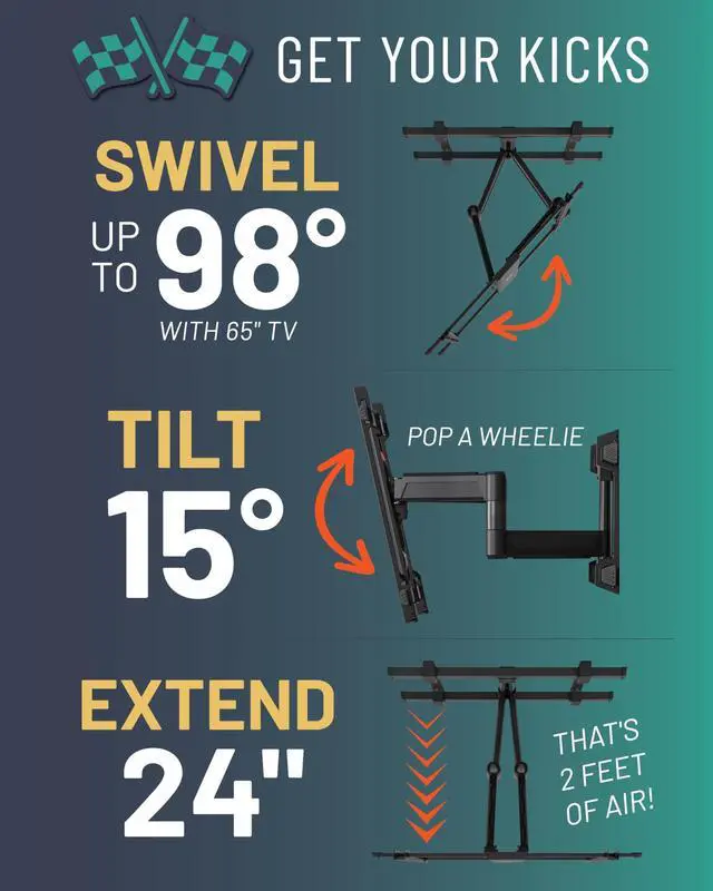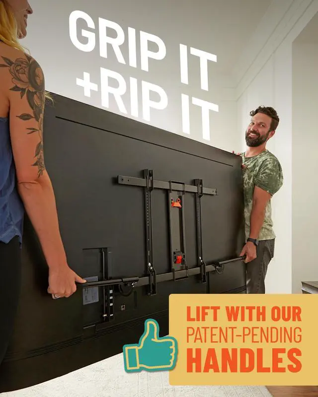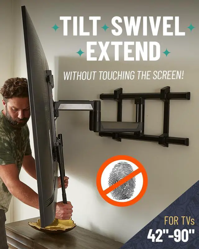 There's only one TV mount in the world with integrated adjustment handles, and you're looking at it. The patent pending handles assist with lifting the TV, and enable touch-free TV adjustments after install. That's right, you can extend, tilt, and swivel your TV all without touching the screen. It's like the year 3, 000 in here. ^^ This next-gen wall mount works with almost any TV up to 90", and is the perfect OLED TV companion. OLED screens are extremely fragile and hard to clean, so you want to avoid touching them.