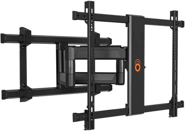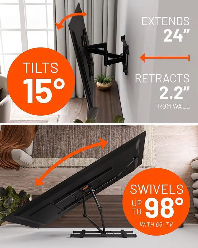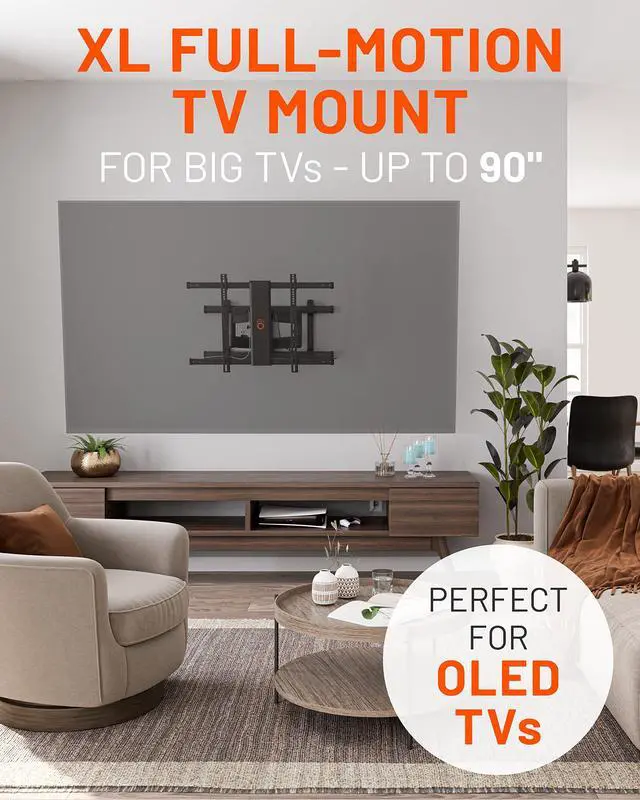 Meet the heavyweight champion of TV mounts! Capable of taming screens up to 90" and supporting a hefty 140 lbs, this mount is the ultimate wall-mounted TV sidekick for your larger-than-life entertainment. ^^ Motion so smooth you won't believe it's not butter! Our full motion mount offers a whopping 24" of smooth extension, along with tilt & swivel capabilities, ensuring you'll always have the best seat in the house. ^^ Conquer mounting in under 30 minutes. The pre-assembled TV interface, drilling template, and a helpful (and humorous) instruction manual will have you feeling like a modern-day DIY superhero! ^^ Ideal for off-center stud spacings.
